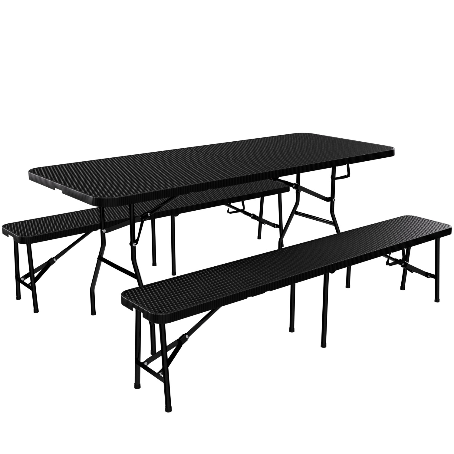 Robustes Material für maximale Stabilität:Die Garnitur besteht aus Kunststoff, welche nicht nur optisch überzeugt, sondern auch extrem langlebig ist. Die Beine aus pulverbeschichtetem Metall sorgen für einen sicheren Stand und machen die Konstruktion besonders robust – perfekt für ausgelassene Feiern oder größere Gruppen. Wetterbeständig und langlebig:Dank einer speziellen Oberflächenbehandlung ist die Bierzeltgarnitur witterungsbeständig und ideal für den Einsatz im Freien geeignet. Ob bei Sonnenschein oder leichtem Regen – die Garnitur bleibt zuverlässig und funktional. Platzsparend und einfach zu transportieren:Die klappbaren Beine von Tisch und Bänken ermöglichen eine kompakte Lagerung und einen einfachen Transport. So können Sie die Garnitur bei Bedarf schnell aufbauen und genauso leicht wieder verstauen. Perfekt für spontane Feiern oder mobile Einsätze. Großzügige Maße für geselliges Beisammensein:Mit einer Länge von 180 cm bietet der Tisch ausreichend Platz für Speisen, Getränke und Dekorationen. Die beiden Bänke sind so konzipiert, dass bis zu 8 Personen bequem sitzen können – genug Raum für Familie, Freunde oder Gäste. Vielseitig einsetzbar für jeden Anlass:Ob für Gartenpartys, Vereinsfeste, Hochzeiten, Biergärten oder gewerbliche Veranstaltungen – diese Bierzeltgarnitur fügt sich nahtlos in jedes Ambiente ein. Ihre zeitlose Optik macht sie zu einem vielseitigen Begleiter für unterschiedlichste Events. Pflegeleicht und schnell zu reinigen:Die Beschaffenheit der Oberfläche ermöglicht eine einfache Reinigung. Verschüttete Getränke oder Essensreste können im Handumdrehen entfernt werden, sodass die Garnitur schnell wieder einsatzbereit ist. Zeitloses Design in klassischer Optik:Die Rattan-Optik verleiht der Garnitur einen eleganten Charme. Dadurch passt sie sowohl in moderne als auch traditionelle Umgebungen und bleibt optisch ein Highlight. Diese Bierzeltgarnitur vereint Funktionalität, Komfort und Stil in einem Produkt – perfekt für jede Feier, ob groß oder klein!