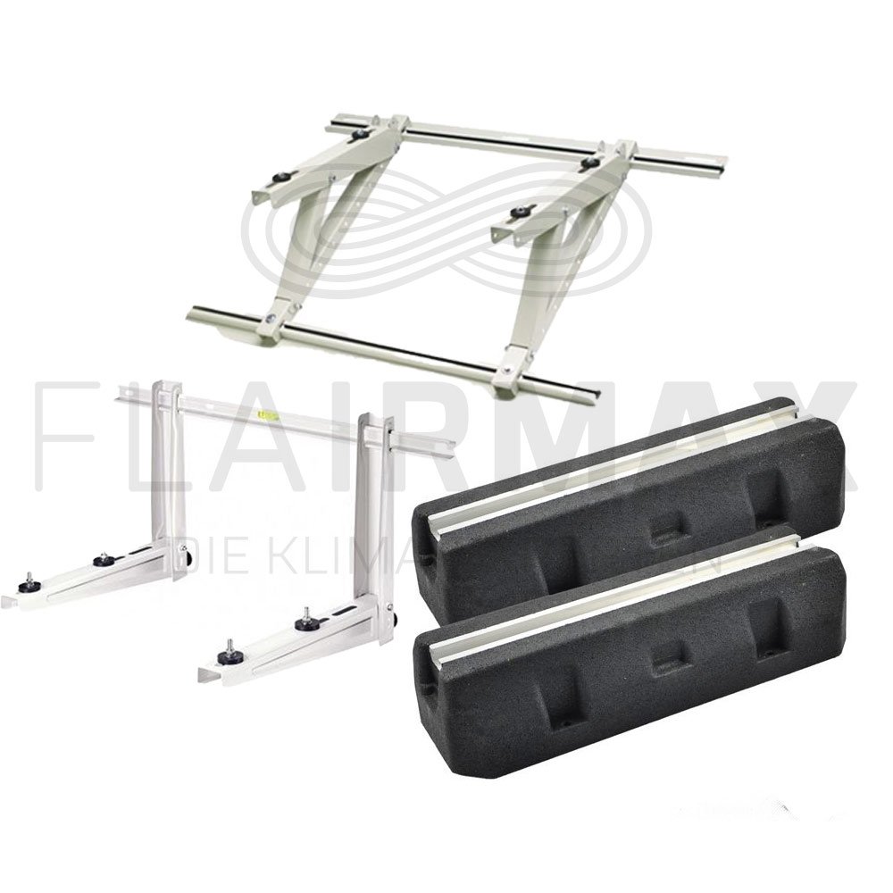 Wählen Sie zwischen: Wandkonsole – zur Befestigung an einer Hauswand Dämpfungssockel (Paar) – für einen ebenen Aufstellort am Boden oder auf dem Flachdach Schrägdachkonsole – Zur befestigung der Außeneinheit auf einem Schrägdach        “”