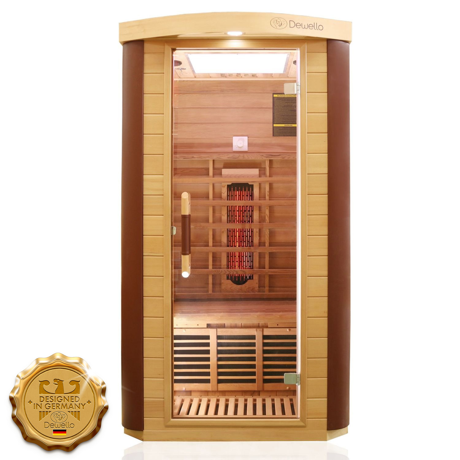 Dewello Infrarotkabine TORONTO ist eine kompakte 1-Personen Kabine (ca. 102 x 102 x 190 cm), die optisch und technisch deutlich aus der Reihe tanzt: innen Zeder für Duft und Premium-Feeling, außen Hemlock für eine ruhige, hochwertige Optik – und vorne an den Ecken auffällige Kunstlederelemente als Design-Statement. Ein echtes Argument für Kunden, die es gern warm mögen: Die TORONTO ist auf bis zu 70 °C ausgelegt. Dazu passt das Heizkonzept als Dual Therm mit insgesamt 7 Strahlern und 1710 Watt Gesamtleistung: 3 Vollspektrumstrahler (rot, je 350 W) plus 4 Karbonflächen für eine angenehme Grundwärme an Seiten, Wade und Boden. Die Vollspektrumleistung lässt sich stufenlos per Drehschalter regeln – ideal, wenn man nicht mit festen Stufen arbeiten will, sondern die Intensität nach Gefühl einstellt. Heizsystem: 3x Vollspektrum (rot, je 350 W) + 4x Karbon Gesamtleistung: 1710 Watt – max. 70 °C Regelung: Vollspektrum stufenlos per Drehschalter Steuerung: Touch innen + außen, Audio (Bluetooth/FM/USB/SD) Beim Licht ist die TORONTO klar PRO-orientiert: Eine große 50 x 50 cm LED-Platine sorgt für intensive Farblichttherapie. Außen sitzt ein LED-Spot, der die Kabine dezent in Szene setzt. Dazu kommt ein sehr schönes Detail für den Alltag: das Zeder-Eckregal mit Glasschale für Getränk oder kleine Accessoires. Licht innen: 50 x 50 cm LED-Platine (Farblichttherapie) Licht außen: 1 LED-Spot Extras: Zeder-Regal, Ionisator inkl. Duftplättchen Verbaut ist transparentes ESG-Glas. Montage per Klick-System, Belüftung über Schiebegitter im Deckel. Anschluss: 220–230 V Haushaltssteckdose. Stromkosten zur Orientierung: ca. 0,43 € pro 30 Minuten.
